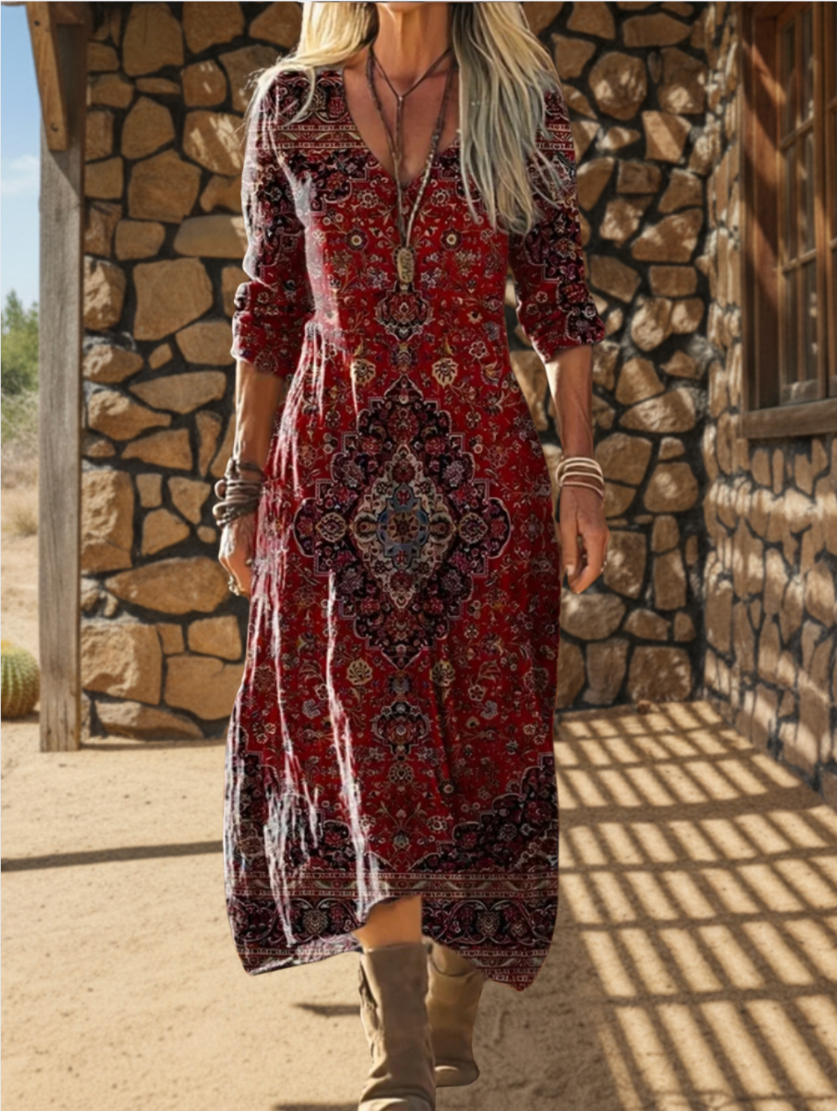 Women's Bohemian Floral Wavy Collage Art Pattern Print Pocket Cotton Dress